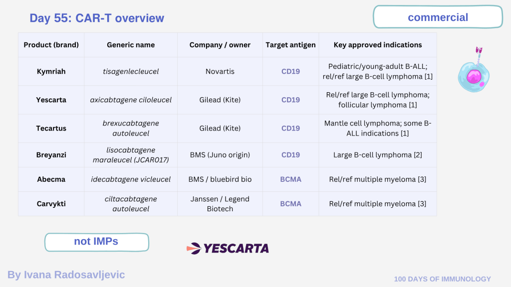 𝘙𝘦𝘨𝘶𝘭𝘢𝘵𝘰𝘳𝘺 𝘴𝘵𝘢𝘵𝘶𝘴: All six products passed FDA review and are available as commercial therapies (not IMPs). Clinical-stage CAR-Ts, by contrast, remain IMPs (Investigational Medicinal Products) [1][3].